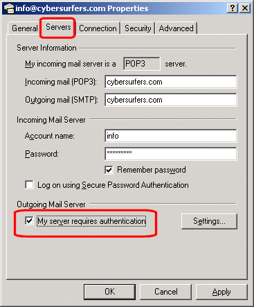 CyberSurfers configures its servers to use industry standard methods for proper and secure delivery and receipt of e-mail. Some Dial-Up, DSL, ISDN, and Cable Internet providers custom configure their networks and may require additional parameters or may have various restrictions and limitations. Although we make every attempt to help our clients configure their e-mail accounts, CyberSurfers is not responsible for the support required to set up your e-mail client settings if your ISP does not use industry standard configurations for Internet connectivity. Additional ISP support is required in about 1 out of 10 e-mail client setups.